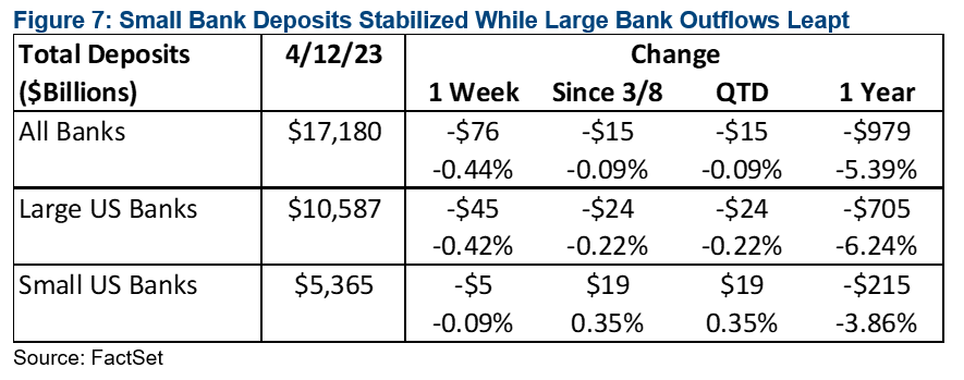 Continua il calo dei depositi totali delle banche commerciali. Dopo l'insolito aumento della settimana precedente, i depositi totali hanno ripreso a diminuire nella settimana terminata il 12 aprile, scendendo di 76 mld $ (44 punti base) ma con deflussi molto maggiori presso le grandi banche (42 punti base) rispetto a quelle piccole (9 punti base). Con almeno un altro aumento dei fondi federali previsto, è improbabile che questa tendenza si inverta nel breve termine.