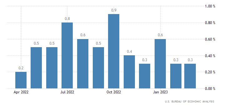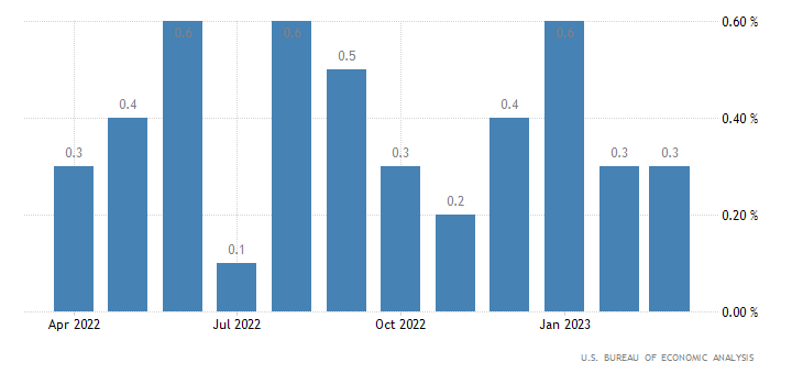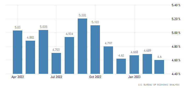 A livello annualizzato, invece, la crescita di marzo è del 4,6%, appena sopra al consensus del +4,5% e sotto al +4,7% di febbraio (rivisto da +4,6%). Il dato è rilasciato dall’U.S. Bureau of Economic Analysis.