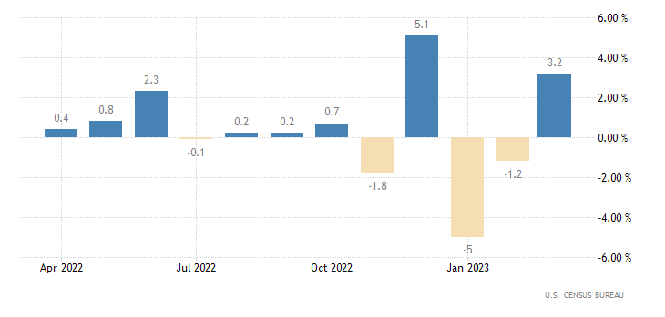 Gli ordini di beni durevoli su base mensile a marzo segnano un +3,2% dopo aver registrato un calo per due mesi consecutivi, in particolare a febbraio un -1,2% (rivisto da -1,0%). Il dato è rilasciato dall’U.S. Census Bureau.