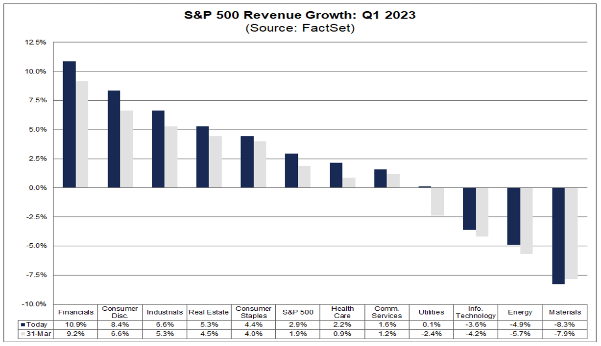 In termini di ricavi, il 74% delle società S&P500 ha riportato ricavi effettivi superiori alle stime, con una percentuale del 2,1% rispetto alle stime degli analisti. Otto settori registrano una crescita anno su anno dei ricavi, guidati dai settori finanziari e dei beni di consumo voluttuari. D'altro canto, tre settori stanno registrando un calo anno su anno dei ricavi, guidati dal settore dei materiali.