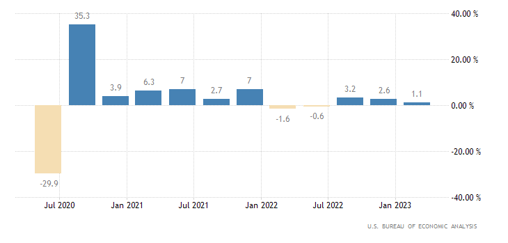 Il PIL USA del primo trimestre è stato rivisto al ribasso molto di più delle attese. I consumi sono stati leggermente sotto attese ma sempre robusti, grazie al gennaio stellare. Gli investimenti sono cresciuti poco (+0.7%) frenati dal calo del equipment e del residenziale, mentre la spesa pubblica ha supportato. Il dato preliminare del primo trimestre 2023 del PIL annualizzato segna un +1,1%, restando sotto al consensus fissato al +2,0% e rallentando rispetto all’ultimo trimestre del 2022 quando la crescita era stata del 2,6%. Il dato è rilasciato dall’U.S. Bureau of Economic Analysis.