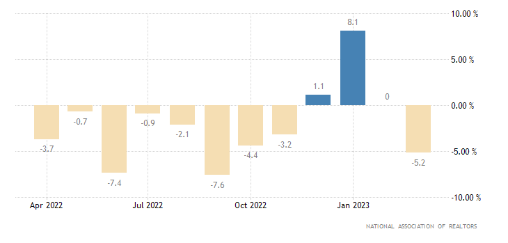 I compromessi di marzo, che anticipano le vendite di case di 45/60 giorni, sono usciti piuttosto deboli. Il problema sembra essere l'esigua scorta di case in vendita, visto che molti proprietari sono bloccati in mutui a tassi molto bassi che non conviene rimborsare. Nel corso d'anno molti cantieri dovrebbero arrivare a completamento, cosa che andrà presumibilmente ad impinguare le scorte. A livello mensile, a marzo il dato sulle vendite immobiliari in corso (che misura il cambiamento nel numero di case con contratto di vendita, ma in attesa della transazione di chiusura, escludendo le nuove costruzioni) incassa un -5,2%, dato in direzione opposta rispetto ad un consensus che indicava una crescita dello 0,5%; a febbraio era stato registrato un +0,0% (rivisto da +0,8%). Il dato è rilasciato dalla National Association of Realtors.