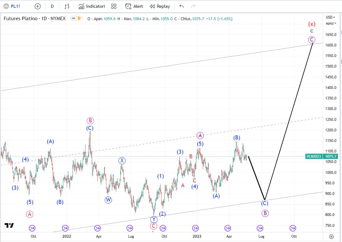 L’argento è in onda (3) di [3]. L’onda (2) deve scendere ancora un po’ attorno a 22,4 poi l’argento dovrebbe riprendere a crescere. Quando il quadro sarà confermato rientreremo long sull’argento.