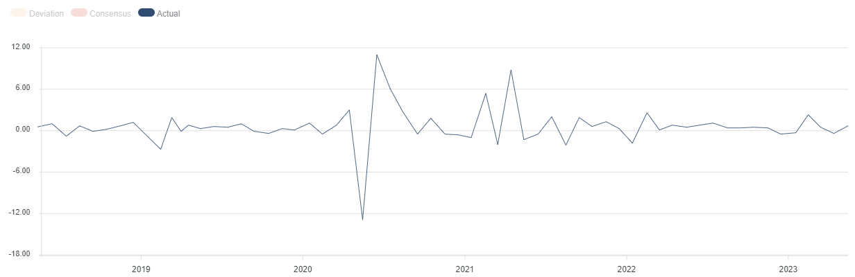 Le vendite al dettaglio Control Group, invece, a livello mensile ad aprile segnano un +0,7% dopo il -0,4% di marzo (rivisto da -0,3%). Il dato è rilasciato dall’U.S. Census Bureau.
