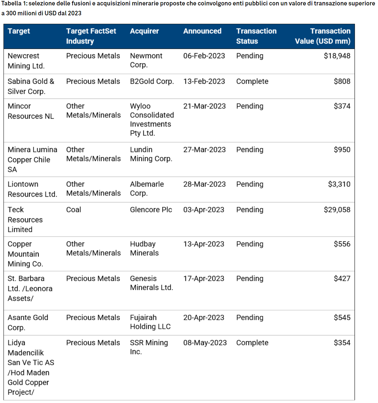 Per tutto il resto del 2023, ulteriori fusioni e acquisizioni nel settore minerario saranno giustificate anche dal rafforzamento o dalla cessione delle esposizioni di produzione a favore di materie prime e giurisdizioni specifiche. Ad esempio, diversificare le entrate nel processo di transizione energetica aggiungendo metalli chiave come il rame (cosa che Newmont sta facendo con l'acquisizione di Newcrest).
