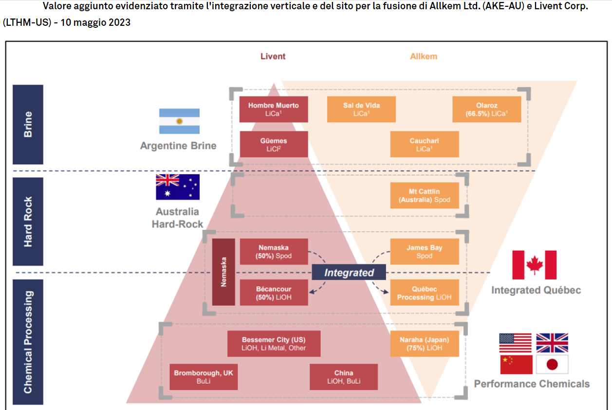 Evidenziamo l'impronta delle proprietà minerarie sia per Newmont che per Newcrest nel prossimo grafico, dove la logica della loro combinazione è un'impronta più forte in Canada e in Australia. Ciò consente loro di realizzare sinergie operative e di catena di approvvigionamento nella loro ricerca per contrastare l'inflazione dei costi. Inoltre, si evidenzia l'impronta operativa condivisa di Allkem Ltd. (AKE-AU o "Allkem") e Livent Corp. (LTHM-US o "Livent"), dove le sinergie aiutano a livello di sito minerario e l'integrazione verticale in la raffinazione del litio nella loro fusione di pari recentemente proposta.