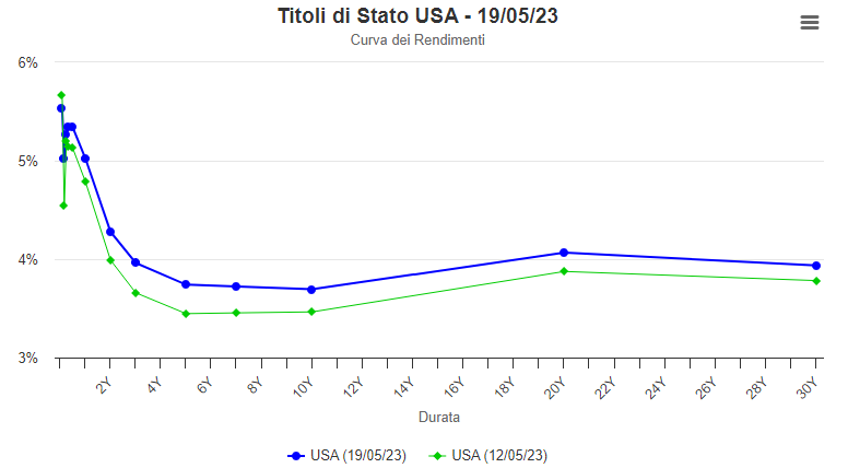 Il Treasury a 10y ritorna in area 3.65% dal 3.70% raggiunto nei giorni precedenti al weekend in scia ai dei dati macro USA usciti meglio delle attese e l’ottimismo legato al debt ceiling. il 2Y USA salito fino al 4,35% scende di 10 bps.