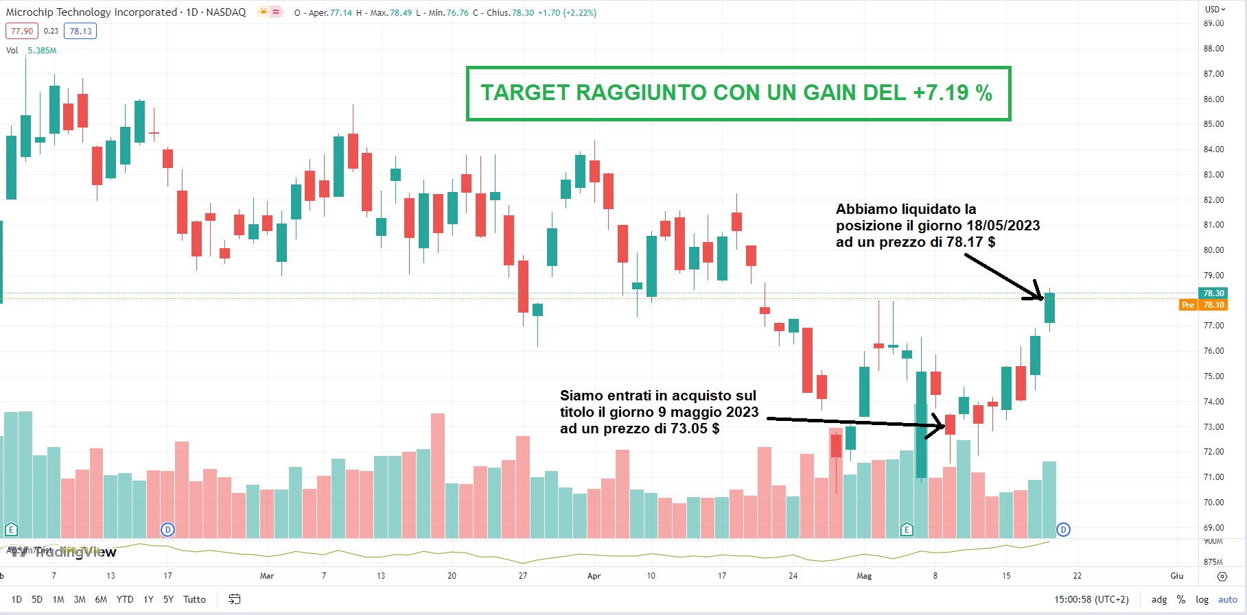 Il giorno 9 maggio 2023 abbiamo acquistato il titolo ad un prezzo di 73.05 $ e dopo solo 8 giorni di contrattazione, precisamente il giorno 18 maggio 2023 il titolo ha raggiunto il nostro livello di target a 78.17 $ al quale abbiamo venduto guadagnando un ottimo 7.19 %.