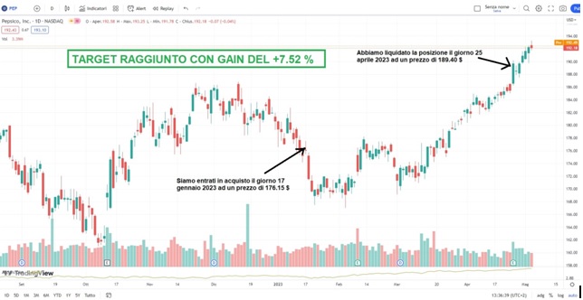Come potete vedere dal grafico siamo entrati in posizione di acquisto lo scorso 17 gennaio 2023 ad un prezzo di 176.15 $ .