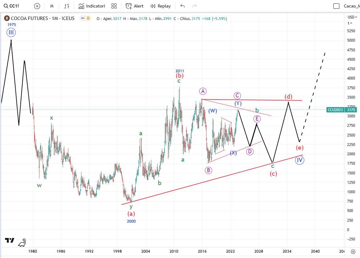 Avevo ipotizzato un’ending diagonal concluso e quindi un cacao pronto a scendere, e invece il modello d’onda ha continuato a suddividere al rialzo per cui siamo rimasti fermi alla finestra. In ogni caso l’onda [v] non dovrebbe avere vita ancora molto lunga. Appena inizierà l’inversione al ribasso cercheremo un punto d’ingresso per una posizione short.