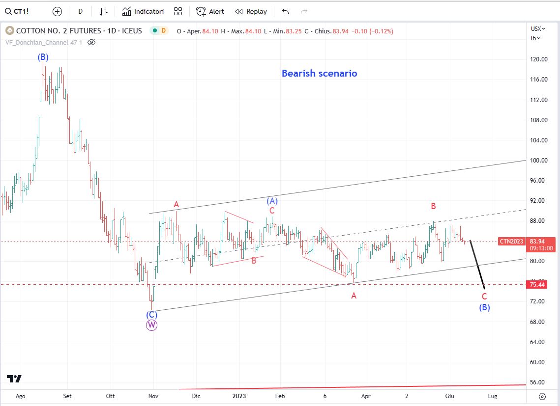 Sul Cotone la settimana scorsa ho preferito uscire con un profitto comunque a due cifre, in quando il modello d’onda ancora una volta si presta a due letture diametralmente opposte e quindi nell’incertezza, meglio uscire con un tozzo di pane.