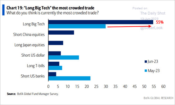 Del resto le azioni tech USA sono il trade più affollato del momento come testimonia il grafico che segue: