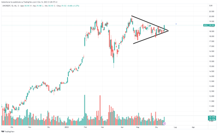 UNICREDIT: rottura di congestione con volumi al rialzo, sembra venire da un manuale di analisi tecnica classica