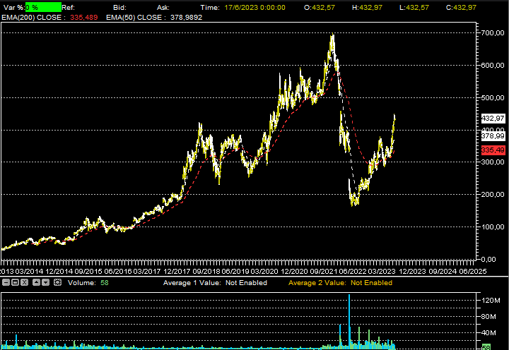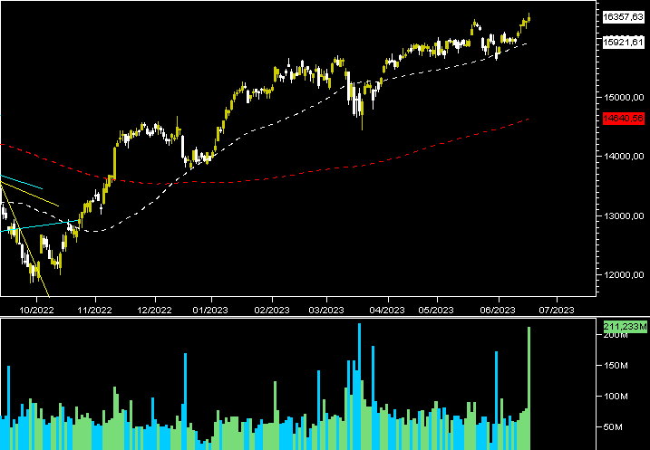 In un articolo recente ( https://www.lombardreport.com/2023/6/9/industrie-de-nora-oltre-i-20/ ) avevamo indicato la possibilità di raggiungere i 15300 a rottura dei 14800 punti. Obiettivo conseguito con successo e senza alcuna esitazione.