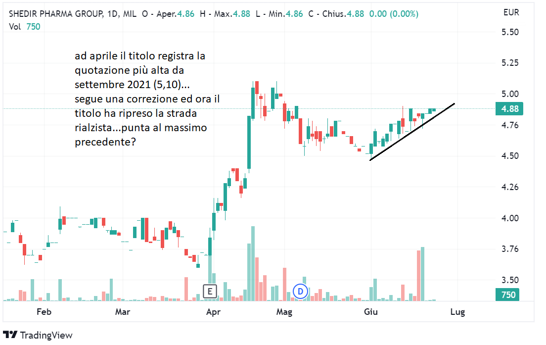 Dopo questo primo sguardo generale, osserviamo quella che è la situazione grafica. Come accennato anche precedentemente, si tratta di un titolo con volumi bassi. A partire da fine marzo il titolo ha attraversato una fase rialzista fino arrivare a toccare il massimo di 5,10 nelle sedute del 19, 20 e 27 aprile, quotazione più alta da settembre 2021. A seguire c’è stata una correzione verso il basso, fino al minimo di 4,48 dell’1 giugno. Ora si sta assistendo ad un nuovo movimento rialzista, con il titolo che potrebbe spingersi nuovamente verso il massimo di 5,10.