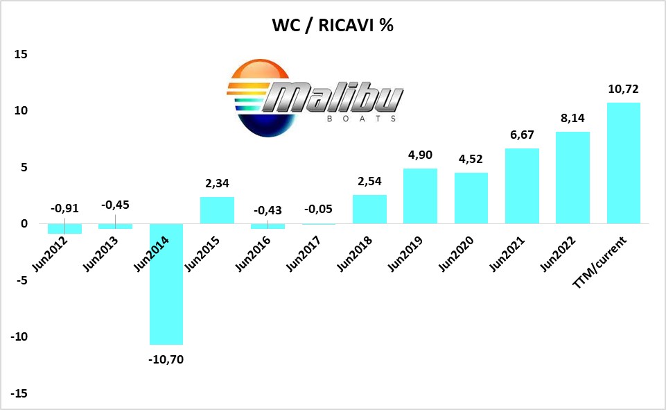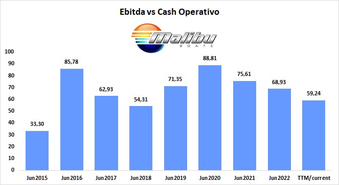 Guardando l’azienda da un’altra prospettiva, si nota che MALIBU BOATS vanta una discreta capacità di conversione dell’EBITDA in CASH OPERATIVO. Il calo registrato nel corso dell’ultimo esercizio è la diretta conseguenza di quanto scritto poco sopra.