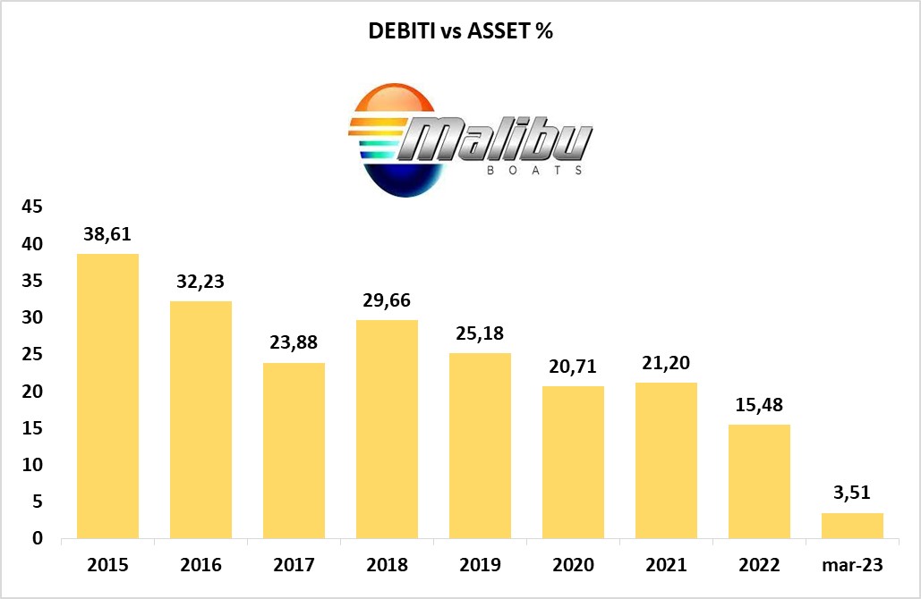 Un altro aspetto decisamente positivo lo si ritrova analizzando la solidità patrimoniale di MALIBU BOATS. La PFN risulta addirittura positiva.