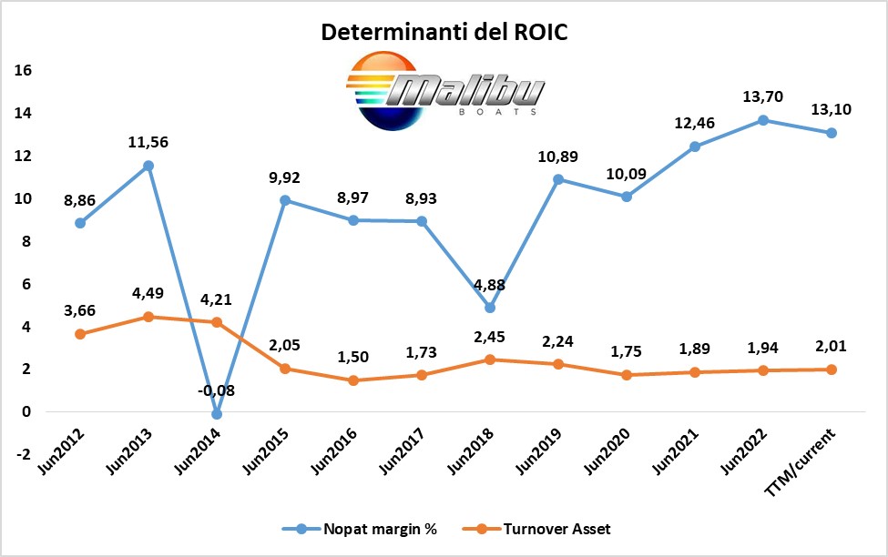 L’andamento del ROIC rispetto al WACC non è che il riflesso di quanto finora descritto: il core business di MALIBU BOATS è stato capace (quasi) sempre di generare rendimenti operativi ben superiori al costo del capitale.