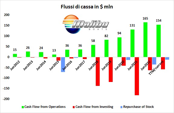 Un altro aspetto decisamente positivo lo si riscontra nei flussi di cassa: MALIBU BOATS, nel corso del tempo, è sempre stata capace di generare flussi di cassa operativi positivi.
