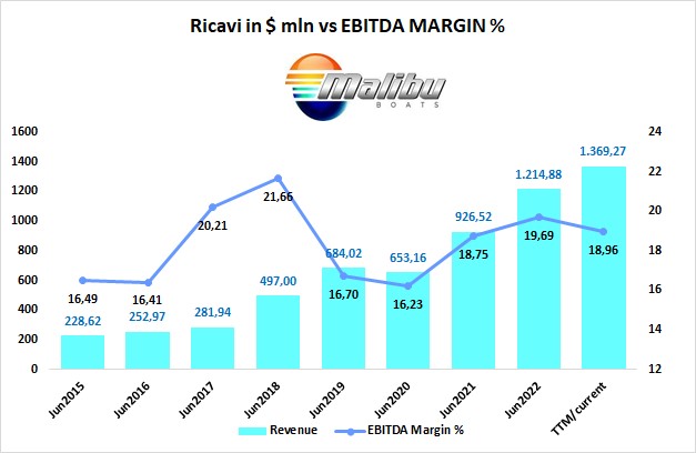 Il core business di MALIBU BOATS unito all’ottimo posizionamento competitivo vantato all’interno del mercato di riferimento hanno consentito alla società di poter riportare nel corso del tempo una marginalità molto elevata.