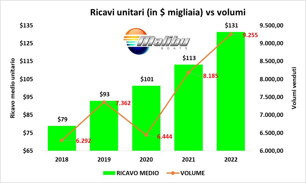 Proseguendo l’analisi, si nota che, nel corso del tempo, MALIBU BOATS ha aumentato progressivamente sia il numero delle barche vendute che il ricavo medio per unità (quasi raddoppiata dal 2018 ad oggi).