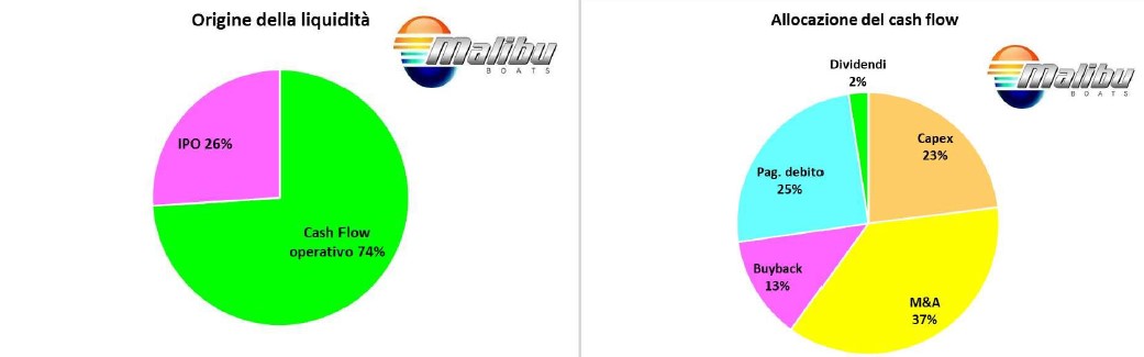 La notevole capacità di generazione di cassa evidenziata dal core business di MALIBU BOATS ha consentito di “autofinanziare” l’attività di investimento che è stata caratterizzata prevalentemente dall’M&A e CAPEX. A tali flussi vanno aggiunti i capitali raccolti in sede di IPO: la somma di queste due determinanti ha consentito a MALIBU BOATS di evitare di ricorrere alla leva finanziaria.