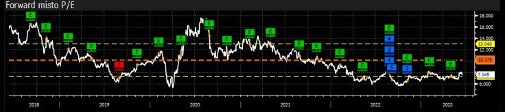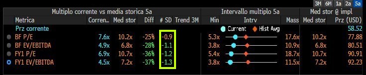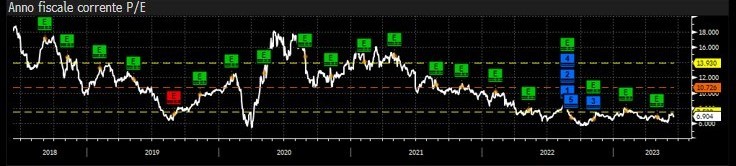 P/E forward: il multiplo è attualmente a 7,65, distante quasi una deviazione standard dal valore medio degli ultimi cinque anni (10,2).