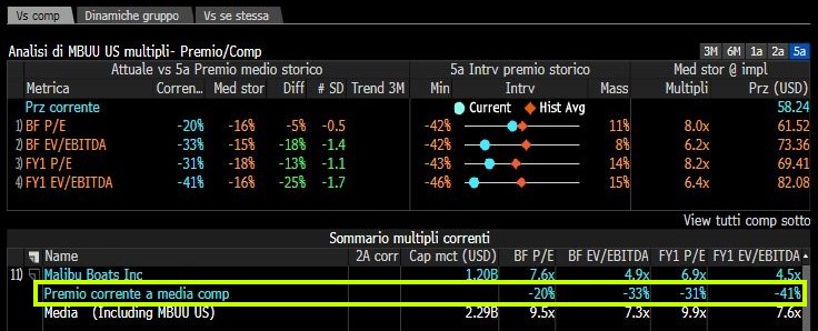 Confronto con i competitor: alle quotazioni attuali, la situazione di MALIBU BOATS evidenzia un livello di sconto molto importante rispetto ai comparables (dal 20% del P/E al 41% dell'EV/EBITDA forward).