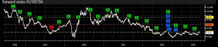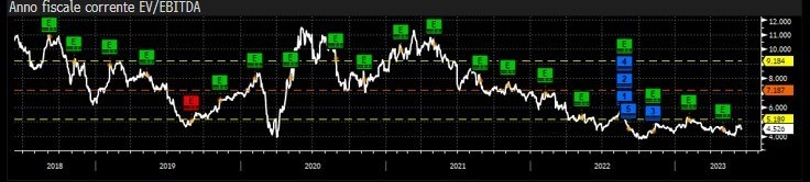 EV/ EBITDA forward: il valore è attualmente a 4,91, molto inferiore rispetto alla media evidenziata negli ultimi cinque esercizi (6,8).