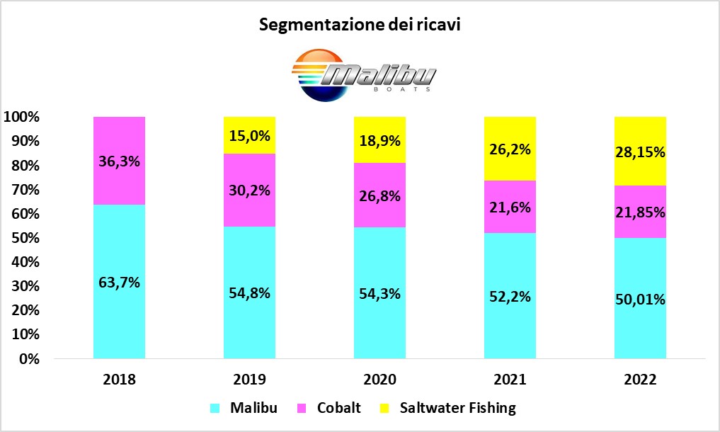 Grazie alle numerose acquisizioni, il business di MALIBU BOATS è diviso in tre linee di business: dalla figura qui sotto si nota che, la nicchia “SALTWATER FISHING” assente prima del 2019, ha progressivamente aumentato la propria rilevanza.