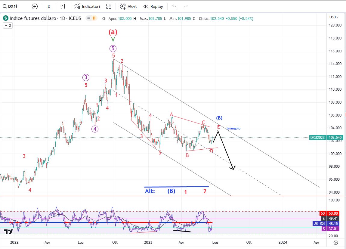 Il trentennale americano ha lateralizzato completando l’onda 4 e dunque nelle prossime sedute mi aspetto una ripresa del ribasso con lo sviluppo dell’onda 5. Previsioni di Borsa : Dollar Index e EUR/USD