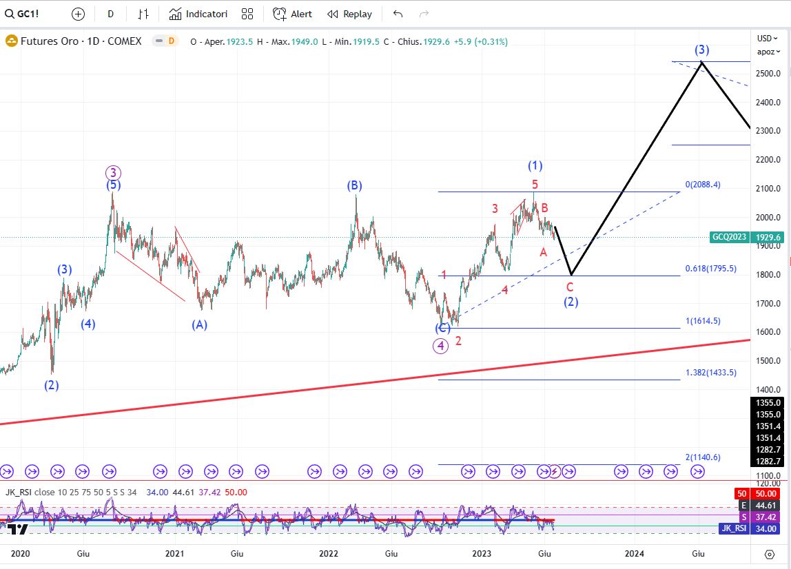 L’oro continua a modellare l’onda (2) che dovrebbe terminare in zona 1790-1800$ e dopo dovremmo vedere una benna onda (3) rialzista su cui entreremo long.