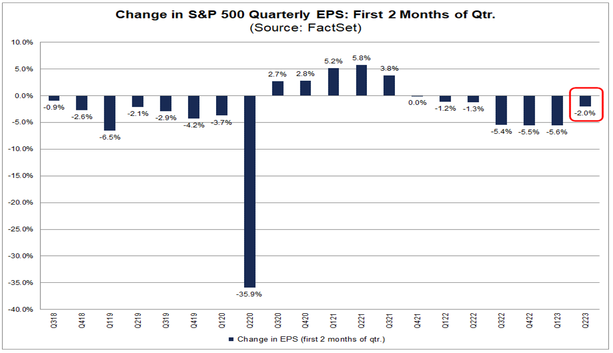 La risposta è no. La stima degli analisti per gli utili EPS del secondo trimestre è diminuita in media solo del 2,0% (a 53,28 $ 54,38 $) dal 31 marzo al 31 maggio.