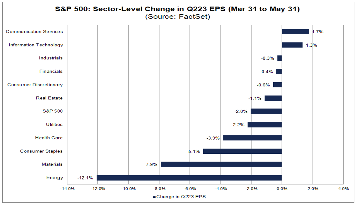 A livello settoriale, nove degli undici settori hanno registrato una diminuzione della stima degli analisti per gli utili del secondo trimestre 2023, guidati dai settori Energia (-12,1%) e Materiali (-7,9%). D'altra parte, due settori hanno registrato un aumento della stima degli analisti e sono: i servizi di comunicazione (+1,7%) e tecnologia dell'informazione (+1,3%).
