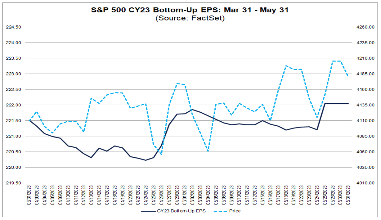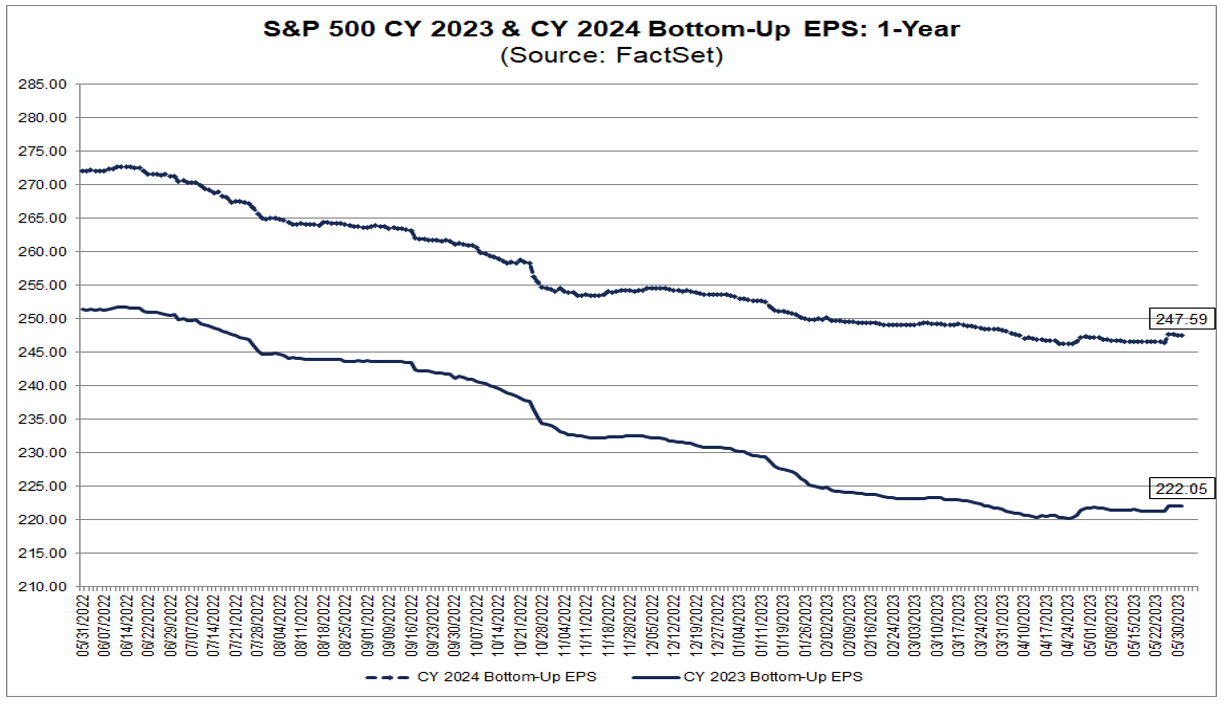 Sempre nel periodo dal 31 marzo al 31 maggio, li analisti hanno leggermente aumentato le stime degli utili in aggregato per tutto il 2023. La stima è aumentata dello 0,2% (a 222,05 $ da 221,51 $).