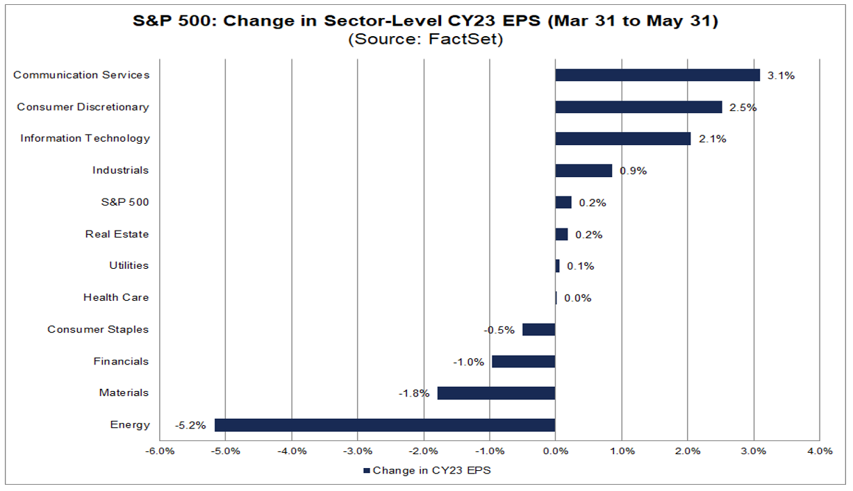 A livello di settore, sette settori hanno registrato un aumento della stima degli analisti per gli utili di tutto il 2023, guidati dai servizi di comunicazione (+3,1%), dai beni di consumo voluttuari (+2,5%) e dalla tecnologia dell'informazione (+2,0%) settori. D'altra parte, quattro settori hanno registrato un calo della stima per l'anno fiscale 2023, guidati dai settori Energia (-5,2%) e Materiali (-1,8%).
