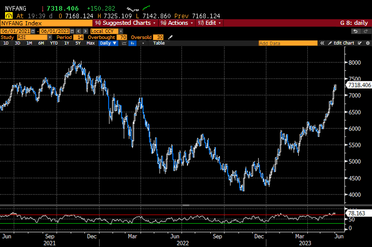 4) La perdurante euforia sul tech che vede l'esplosione di titoli coinvolti nell'AI e in generale big caps, che continuano il loro movimento parabolico (vedi grafico dell' Indice Faang, +64% da inizio anno che contiene al momento Nvidia, Meta, AMD, Netflix, Google, Amazon, Microsoft, Snowflake, Apple, Tesla)