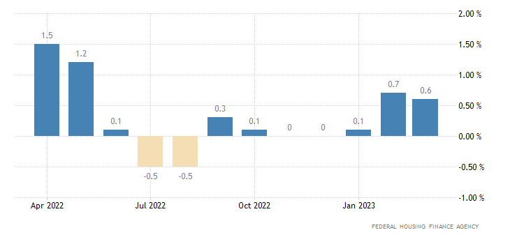 I prezzi delle case in marzo hanno completato quello che sembra un quadro di stabilizzazione dell'immobiliare (new home sales in recupero, fiducia dei homebuilders anche, nuovi cantieri in stabilizzazione e prezzi in rimbalzo) L’indice di prezzo delle case a livello mensile a marzo cresce dello 0,6%, contro un consensus che indicava un rialzo solo dello 0,2% e dopo una crescita di febbraio dello 0,7% (dato rivisto da +0,5%). Il dato è rilasciato dalla Federal Housing Finance Agency.