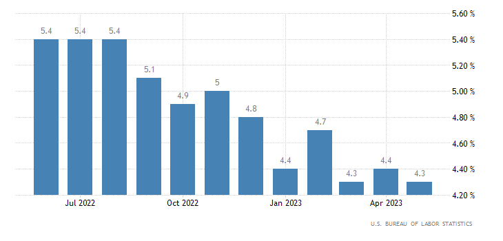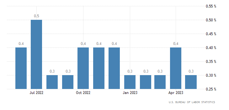 A livello annualizzato la crescita di maggio è del 4,3%, appena inferiore al 4,4% di aprile. I dati sono rilasciati dall’U.S. Bureau of Labor Statistics.