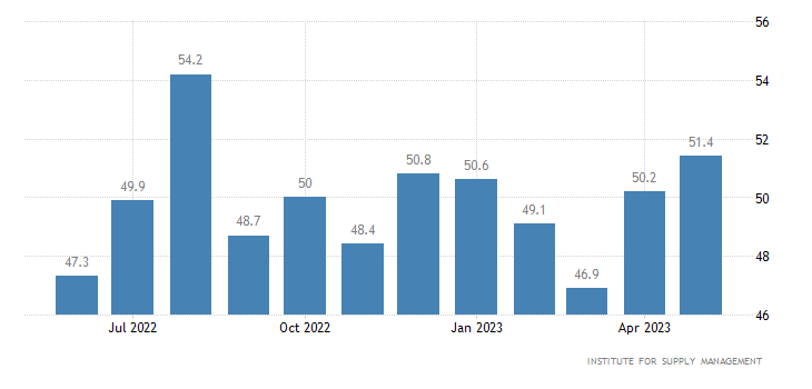 L’indice relativo all’occupazione nel settore manifatturiero rilasciato da ISM a maggio è ulteriormente sceso, sfiorando i minimi di marzo. Il dato tocca quota 51,4 punti, dato più alto da agosto 2022 e in rialzo rispetto ai 50,2 punti di aprile.