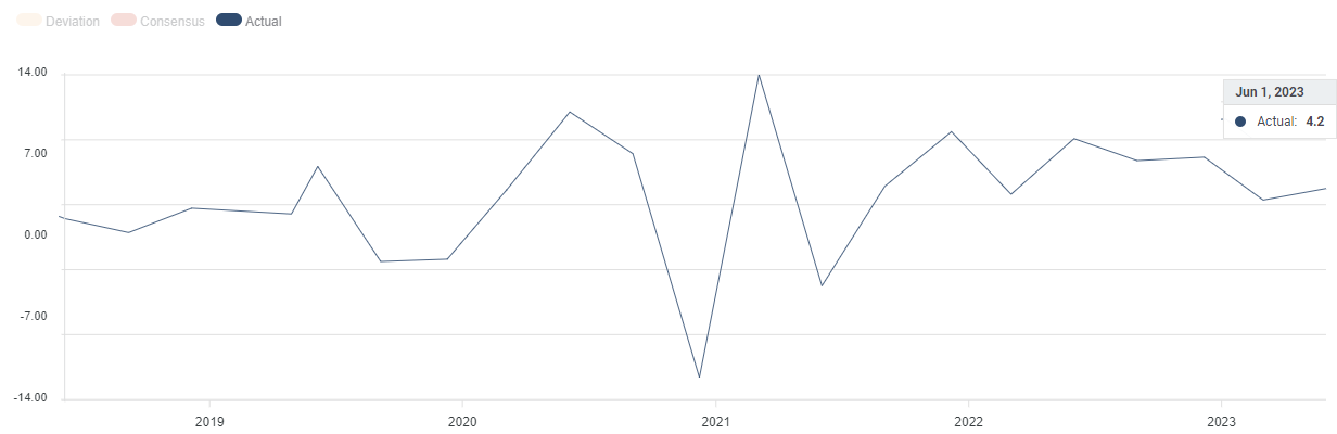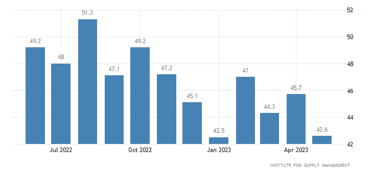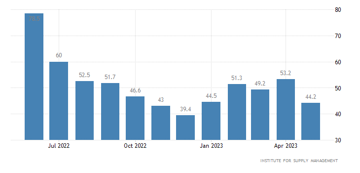 Mentre il dato sui prezzi nel settore manifatturiero rilasciato da ISM fa un balzo indietro, passando dai 53,2 punti di aprile ai 44,2 punti di maggio, dato più basso da dicembre 2022. Il consensus indicava un calo solo fino a 52,0 punti.