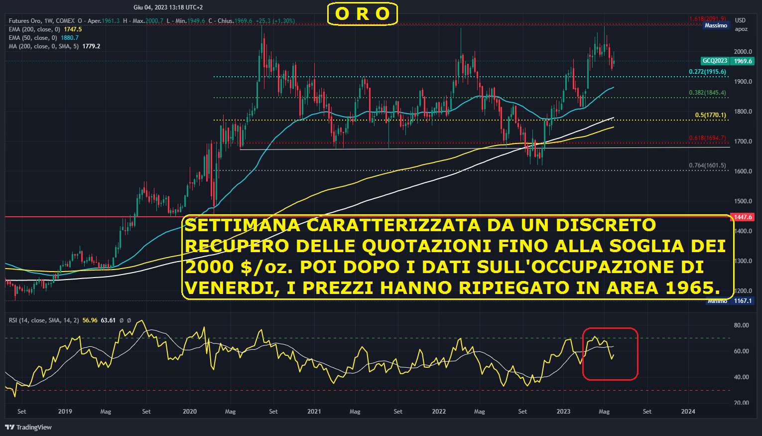 La settimana dell’Oro è si è chiusa a 1969.60 $/oz., in guadagno del + 1,30% rispetto alla scorsa settimana e che porta ad un guadagno da inizio anno del + 7,85%. La settimana della commodity in modalità spot si è chiusa a 1948.46 $/oz. Di seguito il grafico weekly dell’ORO FUTURES AGOSTO 2023: