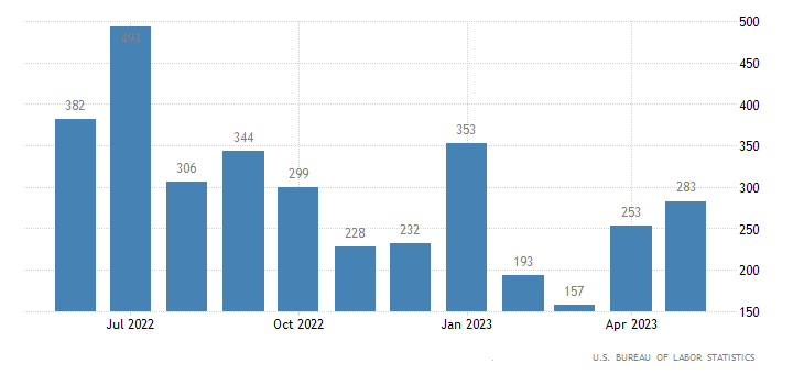 Nel settore non-agricolo privato i posti di lavoro creati a maggio sono stati 283 mila, anche in questo caso in crescita rispetto ai 253 mila di aprile (rivisti da 230 mila). I dati sono rilasciati dall’U.S. Bureau of Labor Statistics.
