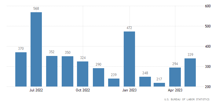 I posti di lavoro creati nel settore non-agricolo a maggio sono stati 339 mila, in rialzo rispetto ai 294 mila di aprile (rivisti da 253 mila).