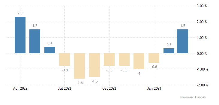 L’S&P/Case-Shiller Home Price Index rilasciato da Standard & Poor’s, che valuta le variazioni nel valore del mercato immobiliare residenziale in 20 regioni degli USA, a livello mensile a marzo segna un +1,5%, ben al di sopra del +0,4% indicato dal consensus e al +0,3% di febbraio (rivisto da +0,2%).