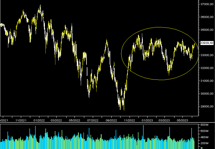 Il Dow Jones invece prosegue con un trading range calmo incluso tra i 32800 e 34200 e sembra non volerne sapere nulla di prendere una direzionalità, come evidenziato da un ellisse che disegnammo molto tempo fa, avendo avvertito una certa apatia da parte degli operatori.