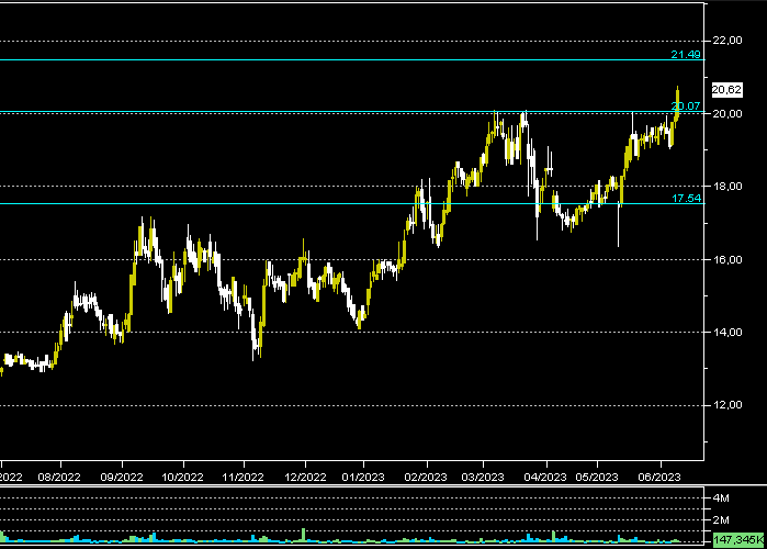 Un target oltre i 20 può essere visto ai 21.5€ ma essendo un obiettivo in prosecuzione di trend, non ci meraviglieremmo se puntasse anche oltre.