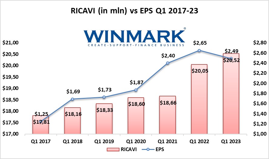 Il primo trimestre del 2023 ha riportato ricavi pressochè in linea con quelli del 2022 (+2,3%). Malgrado una crescita un po' deludente, il livello raggiunto ($ 20,52 mln) rappresenta comunque il record storico per WINMARK CORP.