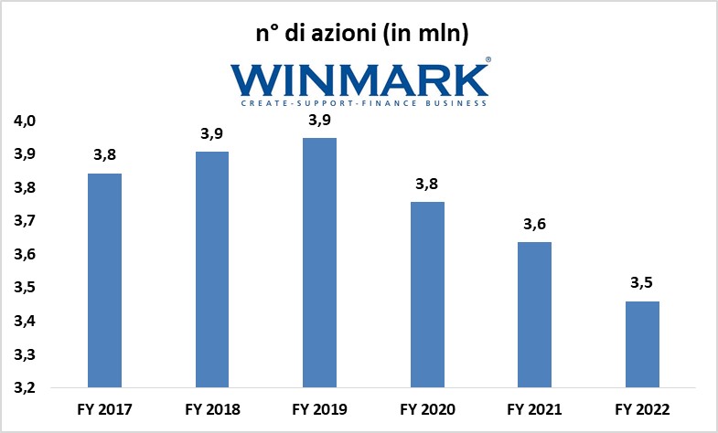 WINMARK CORP, come visto poco sopra, destina la parte rilevante della liquidità generata nel riacquisto di azioni proprie: ma qual è l'effetto del buyback? Dal 2019 ad oggi, il numero di azioni in circolazione di WINMARK CORP è passato da 3,94 mln a 3,45 mln (-12,36%). Per effetto della diminuzione del numero di azioni (annullate per via del buyback), si riduce il denominatore su cui viene diviso il totale dell'utile netto: conseguentemente a ciò, anche a parità di risultato, aumenta il valore degli EPS. Nel caso di WINMARK CORP, nel corso degli anni, al diminuire del denominatore è aumentato anche il numeratore: di fatto è aumentata sia la torta che la fetta!