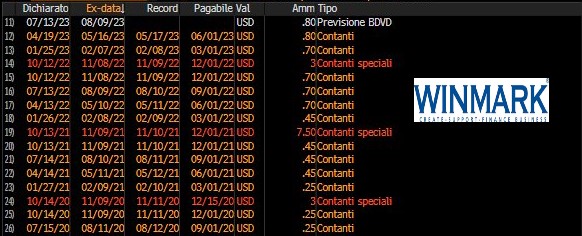 Dal giugno 2020, data in qui WINMARK è stata segnalata all'interno della rubrica, la società ha corrisposto la bellezza di $ 19,65 di dividendi per ogni azione. Tale gradevole fattore, oltre a sommarsi all'effetto valutario, va ad aggiungersi alla variazione in conto capitale (+95%): il rendimento complessivo è pari +121,13%.